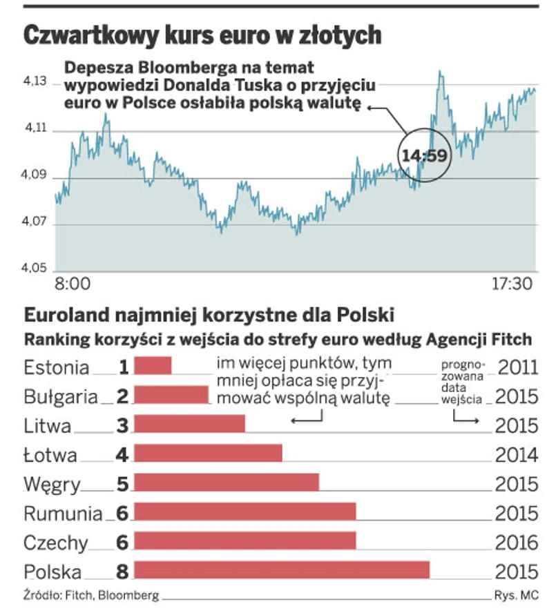 Agencja ratingowa Fitch ocenia, że Polska przyjmie euro nie wcześniej niż w 2015 roku, a nasz kraj spośród państw Europy Środkowej najmniej zyska na wejściu do unii walutowej.