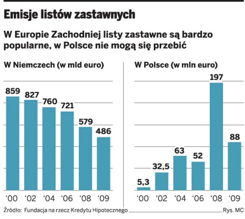 Jak dowiedzieliśmy się w resorcie, trwają właśnie konsultacje w sprawie zmian w ustawie o listach zastawnych. Jej nowelizacja jest niezbędna, bo obecna ustawa z 1997 r. mówi, że listy zastawne – papiery dłużne zabezpieczone kredytami hipotecznymi – mogą emitować wyłącznie banki hipoteczne. A tych w Polsce działa raptem kilka. Efekt jest taki, że emisje są niewielkie, a kredyty udzielone z pozyskanych dzięki listom zastawnym pieniędzy stanowią zaledwie 1 proc. ogółu. Na dodatek taki kredyt, finansowany listami zastawnymi, może być udzielony na maksymalnie 60 proc. wartości nieruchomości. Tymczasem średnia na rynku jest powyżej 75 proc.