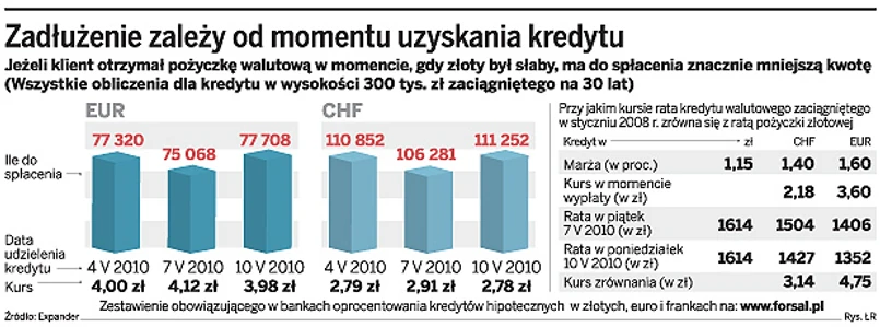 Z wyliczeń Expandera wynika, że w przypadku kredytów walutowych z początku 2008 roku, gdy udzielano ich najwięcej, rata kredytu w euro zrówna się z pożyczką złotową dopiero przy kursie 4,75, a pożyczki frankowej przy cenie 3,14 zł za franka.