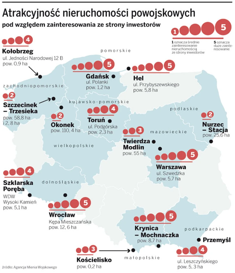 – Najlepiej sprzedają się obecnie nieruchomości o wartości do 5 mln zł – mówi Zbigniew Sergiusz Prokopczyk, dyrektor zespołu gospodarki nieruchomościami AMW. Wyjątkiem może być duża transakcja w Warszawie. Chodzi o carskie koszary u zbiegu ulicy Szwedzkiej i alei Solidarności. Za działkę liczącą blisko 6 ha agencja chce zainkasować 40 mln zł. Być może też uda się sprzedać warte 50 mln zł 6 ha po jednostce wojskowej w centrum Helu. Rok temu nieruchomość miała kupić VEA Development, spółka córka znanego na Pomorzu dewelopera Invest Komfort. Jednak firma wycofała się z transakcji, a zatrzymane przez agencję wadium w kwocie 6 mln zł stało się przedmiotem sądowego sporu. Niedawno sąd przyznał rację agencji.