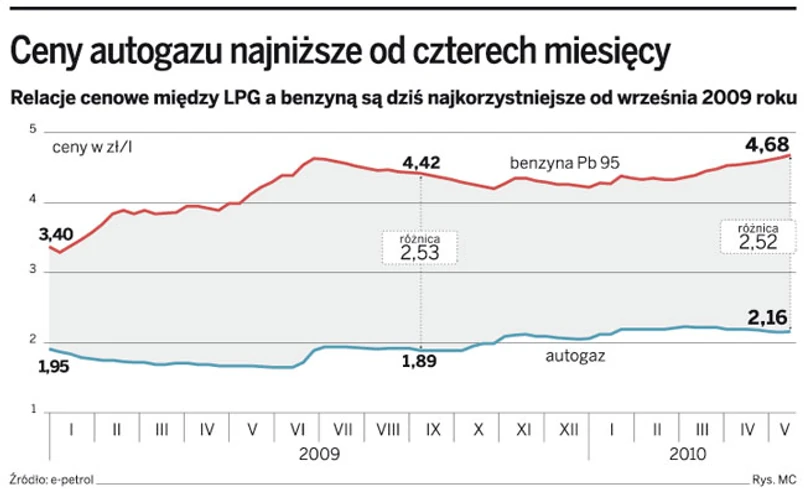 Tak korzystnych relacji cenowych nie było od siedmiu miesięcy. Tymczasem ceny pozostałych gatunków paliw na stacjach dynamicznie pną się w górę. Wszystko wskazuje na to, że jeszcze przed wakacjami za benzynę zapłacimy powyżej magicznego progu 5 zł. Kierowcy zaczęli więc kalkulować i ustawiać się w kolejkach pod dystrybutorami z autogazem. Ci, którzy jeszcze nie mieli instalacji gazowej w swoim samochodzie, decydują się na jej montaż. Warsztaty, które od kilku lat pogrążone były w kryzysie, zaczynają odżywać.