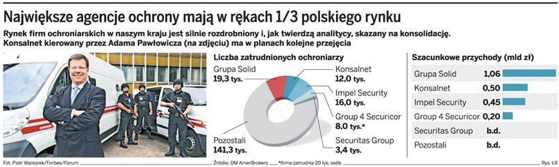 Według niego fuzje i przejęcia są nieuniknione ze względu na silne rozdrobnienie tego rynku. Rosiński szacuje, że obecnie w branży działa ponad 4 tys. firm, które zatrudniają ponad 200 tys. ochroniarzy. Tyle że do pierwszej ósemki należy ok. 36 proc. rynku, podczas gdy w krajach zachodnich wskaźnik koncentracji sięga 80 proc.