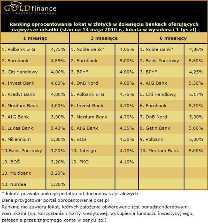 O ile od połowy marca do połowy kwietnia oprocentowanie lokat w złotych obniżyło siedem banków, to w ciągu ostatnich czterech tygodni zdecydowało się na ten krok sześć podmiotów. W trzech przypadkach obniżka dotyczyła liderów naszej klasyfikacji. Z 5 do 4 proc. obniżył oprocentowanie lokaty 1-miesięcznej Kredyt Bank, z 5,2 do 4,7 proc. zmniejszył odsetki z lokaty 3-miesięcznej Meritum Bank i z 5,67 do 5,27 proc. oprocentowanie rocznej lokaty zmniejszył Noble Bank. Przypomnijmy, że w naszym rankingu monitorujemy jedynie banki oferujące najwyższe oprocentowanie lokat o minimalnej wysokości 1 tys. zł, bez uwzględniania jakichkolwiek promocji i ofert łączących lokatę z innymi usługami bankowymi. Najwięcej zmian dotyczyło lokat 1-, 6- i 12-miesięcznych, a obniżki sięgały najczęściej pół punktu procentowego.