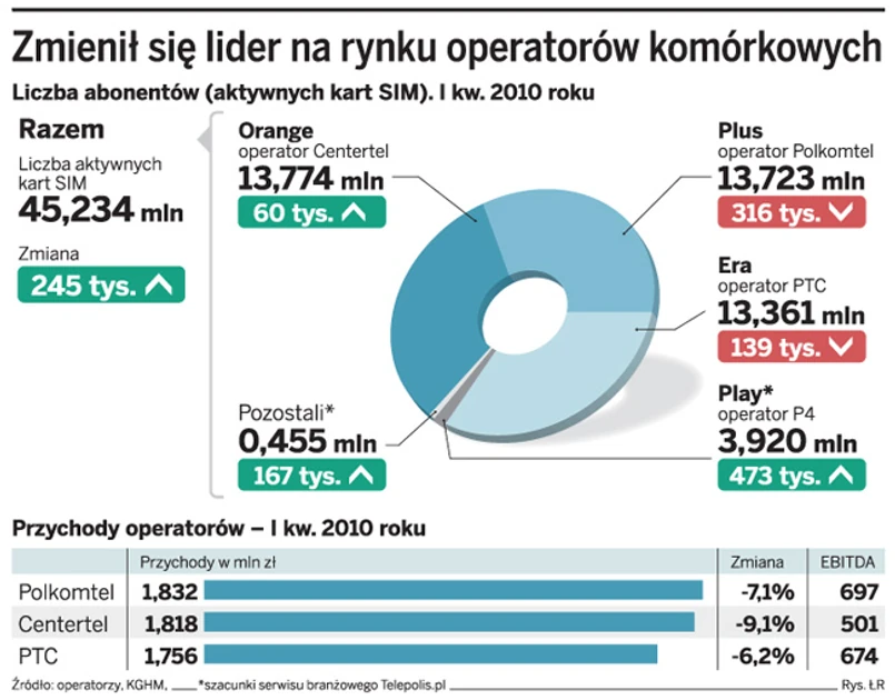Na wymianę lidera zanosiło się od dłuższego czasu. W końcu do niej doszło: po opublikowaniu wyników za I kwartał okazało się, że Centertel, operator sieci Orange, ze swoimi 13,774 mln. aktywnymi kartami SIM jest największy na rynku. Należąca do Telekomunikacji Polskiej firma zwiększyła ich liczbę o 61 tys. w porównaniu z ubiegłym rokiem. To 51 tys. więcej niż Polkomtel, operator sieci Plus, dotychczasowy lider (stracił 316 tys. kart SIM).