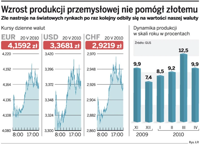 W przełamaniu negatywnego trendu nie pomogły dobre dane o produkcji przemysłowej za kwiecień. Z opublikowanych wczoraj informacji GUS wynika, że produkcja polskiego przemysłu ma się dobrze. W kwietniu wzrosła o 9,9 proc. w skali roku, co ekonomiści tłumaczą dobrą kondycją eksportu.