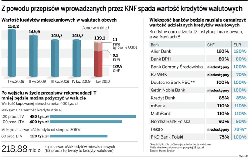 Instytucje finansowe miały też obowiązek zmienić sposób wyliczania zdolności kredytowej przy pożyczkach walutowych. O ile przy kredycie w złotówkach mogło nas być stać na 100 proc. wartości nieruchomości, to przy pożyczce we frankach szwajcarskich musiało nas być stać na 120 proc. Teraz będzie jeszcze trudniej. – Należy się liczyć z ograniczeniem kredytów walutowych, a akcja kredytowa w ogóle może być o 5 proc. mniejsza – mówi Krzysztof Pietraszkiewicz, prezes Związku Banków Polskich.