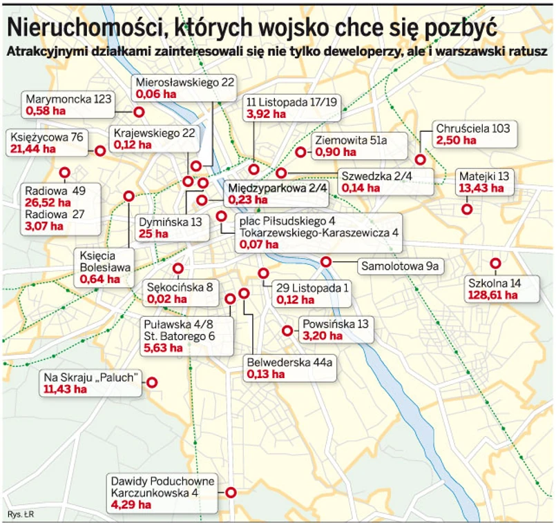 Wydaje się jednak, że Agencja nie zdawała sobie sprawy z faktu, iż wobec niektórych jej działek miasto ma już konkretne plany. Np. teren wojskowej nieruchomości przy 29 listopada 1 ma zostać przeznaczony na poszerzenie ulicy. A tereny w Rembertowie – na budowę obwodnicy. Swoje plany mogą mieć również burmistrzowie dzielnic. – Jest prawo, które mówi, że tereny, na których samorząd będzie chciał zbudować obiekty użyteczności publicznej, powinny zostać przekazane przez wojsko w darowiznę. W uzasadnionych przypadkach będziemy z tego zapisu korzystać – zapowiada rzecznik ratusza Tomasz Andryszczak.