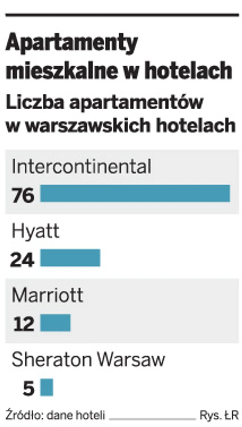 Już teraz trzeba zamawiać najbardziej atrakcyjne apartamenty – duże, z oddzielnymi sypialniami – ze sporym wyprzedzeniem. Chętnych nie brakuje. Nic dziwnego: cena apartamentu mieszkalnego jest o niemal 30 – 40 proc. niższa niż tradycyjnego pokoju hotelowego. Miesięczny ich wynajem to koszt około 10 tys. zł. Taka inwestycja dla hotelu to pewne źródło zarobku, bo klienci rezerwują je najczęściej na okres od trzech do sześciu miesięcy.