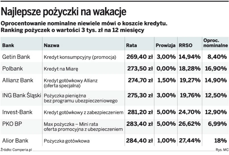 Z zestawienia wynika jednak, że w porównaniu z ub.r. kredyt na wakacje może być tańszy. Średnie RRSO jest bowiem obecnie niższe o 0,15 pkt proc. niż rok temu.
