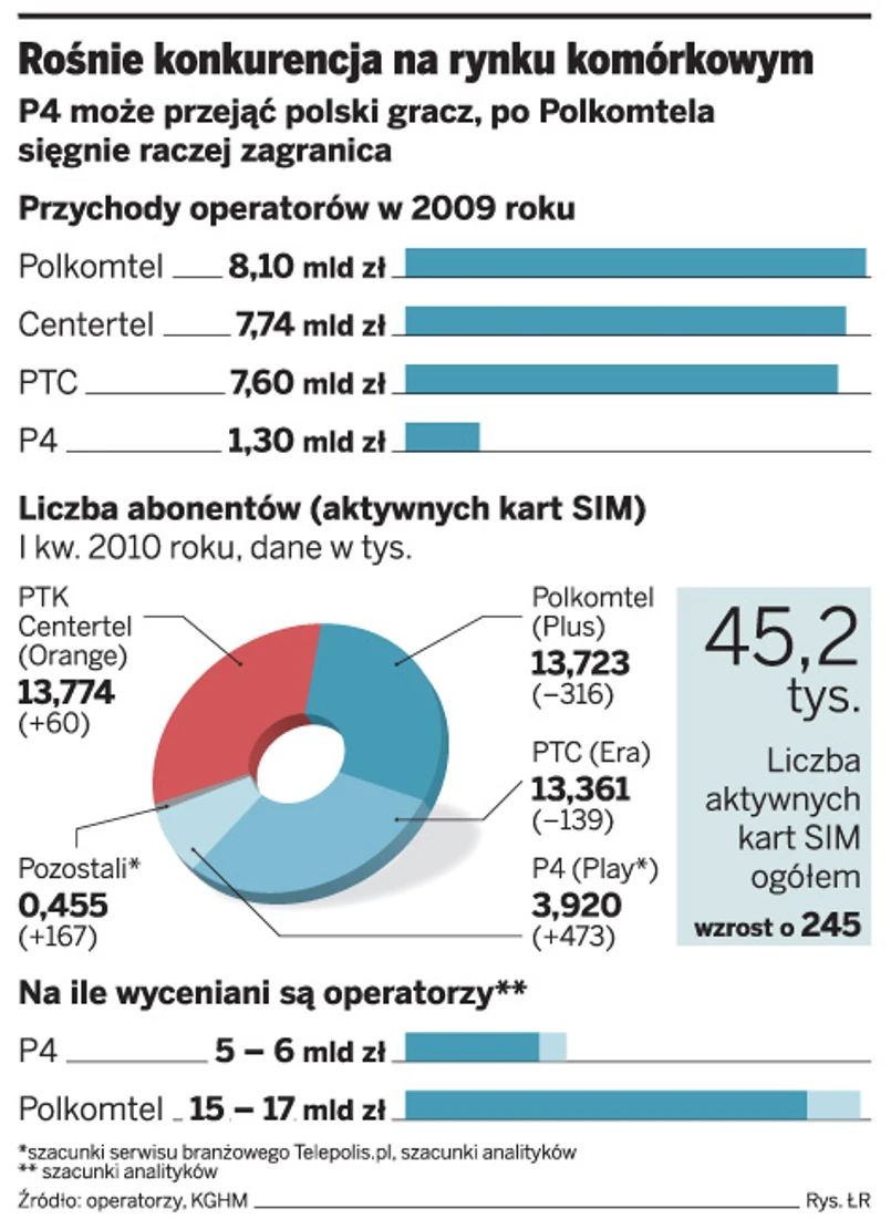 Analitycy obecnie wyceniają operatora na 5 – 6 mld zł. Wśród potencjalnych zainteresowanych wymienia się też Zygmunta Solorza-Żaka, który buduje swoje imperium telekomunikacyjne wokół spółek Sferia, Aero2 i Cyfrowy Polsat. W wywiadzie dla „DGP” przyznał niedawno, że chce konsolidować rynek i nie wyklucza żadnego ruchu. Także przejęcia innego, wystawionego na sprzedaż gracza – Polkomtelu. Udziały w nim sprzedać chce PKN Orlen, PGE, KGHM i Vodafone. Nie wiadomo jednak, kto będzie kupcem. Analitycy wyceniają spółkę na co najmniej 15 mld zł. TP czy PTC nie dostałyby na taką transakcję zgody UOKiK. Zygmuntowi Solorzowi też trudno byłoby znaleźć taką kwotę.