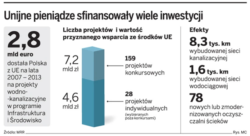 – Fundusze unijne z programu Infrastruktura i Środowisko pozwolą zrealizować to zobowiązanie w ponad 50 proc. gmin – mówi Adam Ździebło. Za dotacje powstanie ponad 9 tys. km z zaplanowanych 20 tys. km linii wodno-kanalizacyjnych. Do tego należy doliczyć inwestycje już zrealizowane w ramach unijnych dotacji na lata 2004 – 2006 (ok. 80 projektów) oraz finansowane np. ze środków Narodowego Funduszu Ochrony Środowiska i Gospodarki Wodnej.