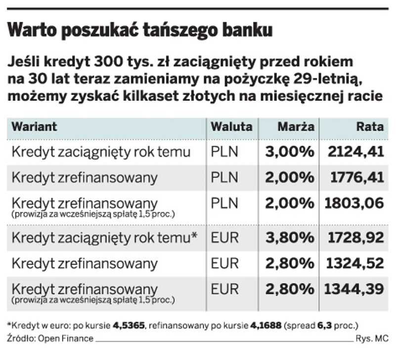 Można na tym sporo zaoszczędzić. Przy kredycie złotowym w wysokości 300 tys. zł, udzielonym przed rokiem na 30 lat, można zmniejszyć miesięczna ratę z 2,1 tys. zł, poniżej 1,8 tys. zł. Rata będzie nieco wyższa (ok. 30 zł), jeśli bank, któremu oddajemy cały kredyt przed terminem, zażąda prowizji za wcześniejszą spłatę.