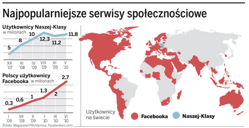 Prawie pół miliarda użytkowników Facebooka to prawdziwa potęga. O serwisie mówi się już, że jest trzecim pod względem liczby ludności krajem świata. Po jego ogromnej ofensywie z ostatnich miesięcy ledwie w kilku państwach pozostały silne lokalne serwisy społecznościowe. Facebook wciąż przegrywa w Chinach z QQ, w Rosji z Odnoklasniki i W Kontaktie, a w Brazylii najpopularniejszy pozostaje Orkut, należący do Google’a. I jeszcze w Polsce niepodzielnie rządzi Nasza-Klasa.
