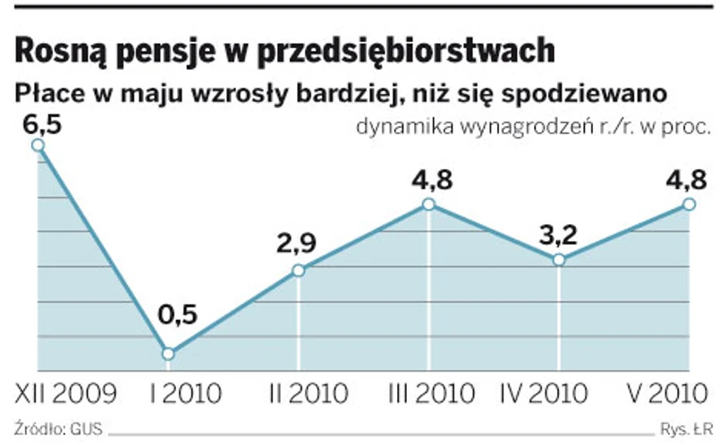 Ekonomiści Banku BPH także wątpią we wzrost presji płacowej. Ich zdaniem może to być skutek efektu bazy: wynagrodzenia w ubiegłym roku rosły słabo. Jednak eksperci banku zwracają uwagę, że stopniowo odbudowuje się popyt na pracę w firmach, na co wskazuje rosnące zatrudnienie. To był jeden z czynników, który zdecydował o zwiększeniu funduszu płac. W porównaniu z majem 2009 roku wzrosło ono o 0,5 proc. To niewiele, ale z drugiej strony po raz pierwszy od stycznia 2009 roku mamy wzrost.