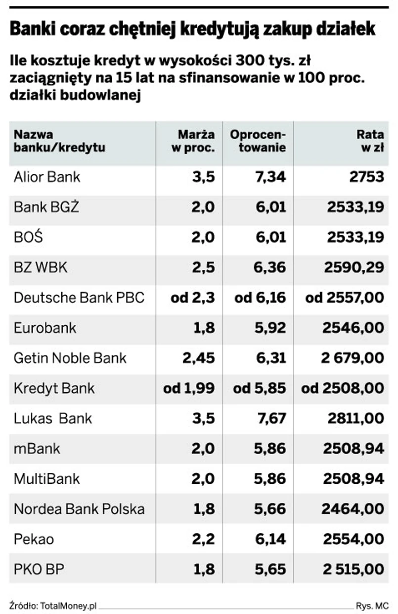 Z zestawienia przygotowanego przez TotalMoney wynika, że już 14 banków udziela w tej chwili kredytów na kupno całej nieruchomości (w tym największy – PKO BP). Podobnie jak przy kredytach mieszkaniowych banki proponują też coraz niższe oprocentowanie. Nie brakuje ofert pożyczek na kupno ziemi, z marżą poniżej 2 proc. (przy 100-proc. LTV). Gwarantuje to dzisiaj oprocentowanie nawet poniżej 6 proc. (np. w Eurobanku, Kredyt Banku, mBanku, MultiBanku, Nordei i PKO BP).