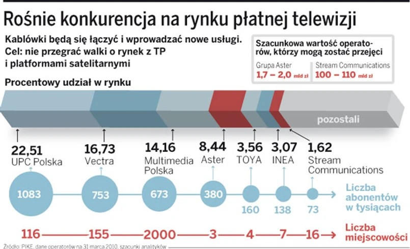 Najwięksi gracze na rynku kablówek – UPC Polska, Vectra i Multimedia – szukają okazji do przejęć i rozwoju oferty. Na ich celowniku jest czwarty co do wielkości operator – Grupa Aster.