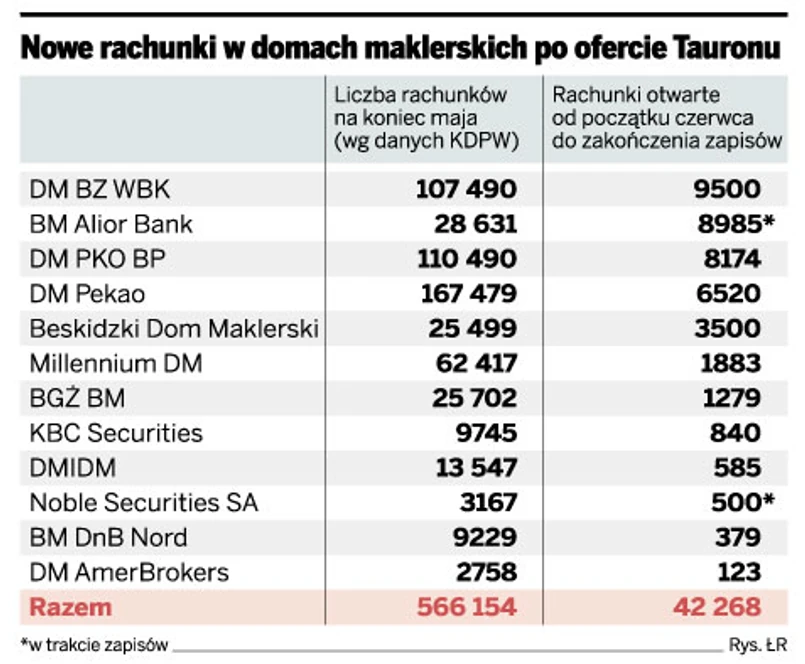 Z informacji przekazanych „DGP” przez 12 domów maklerskich wynika, że od początku czerwca do końca zapisów na akcje Tauronu otwartych zostało u nich niemal 42,3 tys. nowych rachunków.