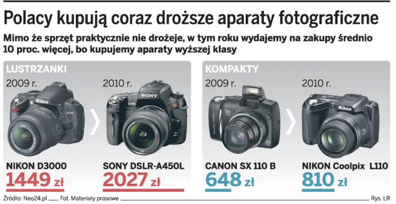 O ile przed dwoma laty lustrzanki gwałtownie staniały – niektóre modele nawet o 40 proc. – to teraz ceny są stabilne. Mimo to średnie wydatki na sprzęt stale rosną. W stosunku do ubiegłego roku przeznaczamy na nie o blisko 10 proc. więcej.