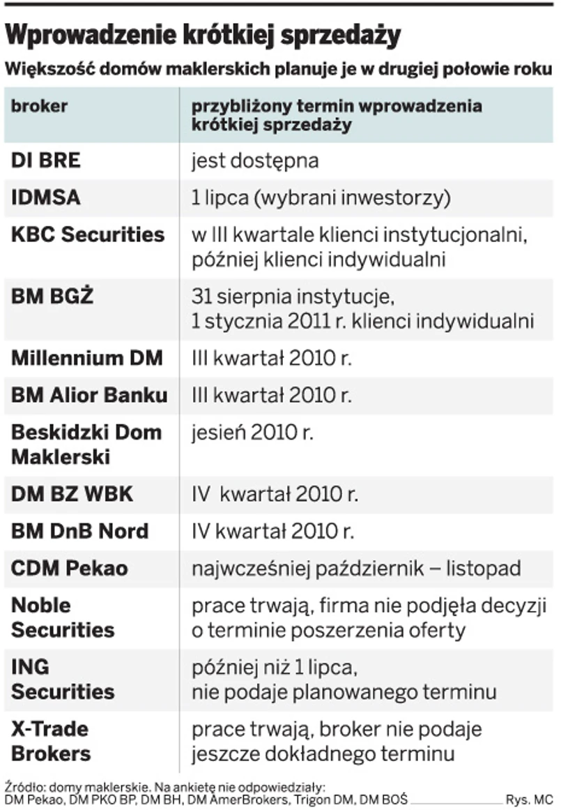 Pozostali brokerzy, jak ustalił „DGP”, planują wprowadzenie krótkiej sprzedaży do oferty z reguły w III lub IV kwartale tego roku. Brokerzy dopiero niedawno poznali zasady przeprowadzania transakcji krótkiej sprzedaży, opracowane przez GPW oraz Krajowy Depozyt Papierów Wartościowych. Na dodatek przepisy te wymagają od brokerów wprowadzenia zmian m.in. w systemach informatycznych. Chodzi np. o to, że zlecenia krótkiej sprzedaży mają być specjalnie oznaczane. – Niestety terminy u dostawców oprogramowania są długie – mówi Łukasz Piasta z Banku DnB Nord.