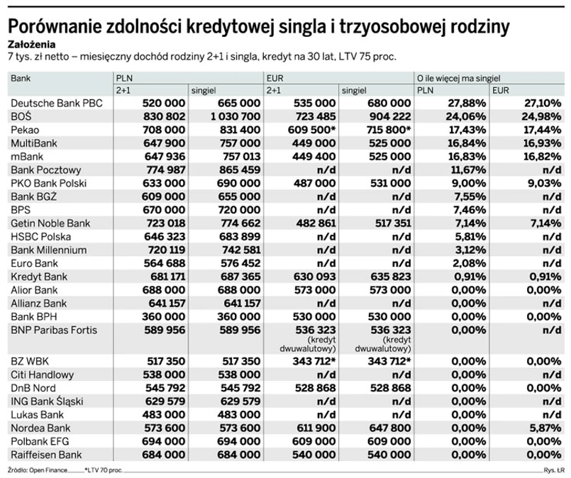 W tym banku singiel dostanie kredyt o 145 tys. zł większy niż rodzina, a w BOŚ ta różnica wynosi aż 200 tys. zł. W Pekao, mBanku, MultiBanku zdolność kredytowa singla jest o 100 – 120 tys. zł wyższa niż rodziny.