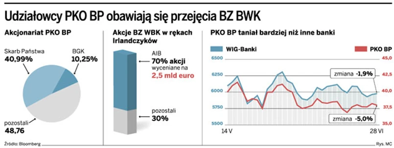 Jak się dowiedzieliśmy, poważnie rozważany jest pomysł np. emisji obligacji podporządkowanych. Dzięki temu bank zyskałby pieniądze i nie byłby zmuszony do przeprowadzania emisji, która z kolei groziłaby zmniejszeniem udziału Skarbu Państwa w akcjonariacie banku. Udało nam się także ustalić, że PKO BP wchłonie przynajmniej część BZ BWK. Reszta nie zniknie z rynku, tylko zostanie sprzedana. To oznaczałoby powtórkę z podziału BPH, który w części został wchłonięty przez Pekao, a resztę kupili Amerykanie z GE.