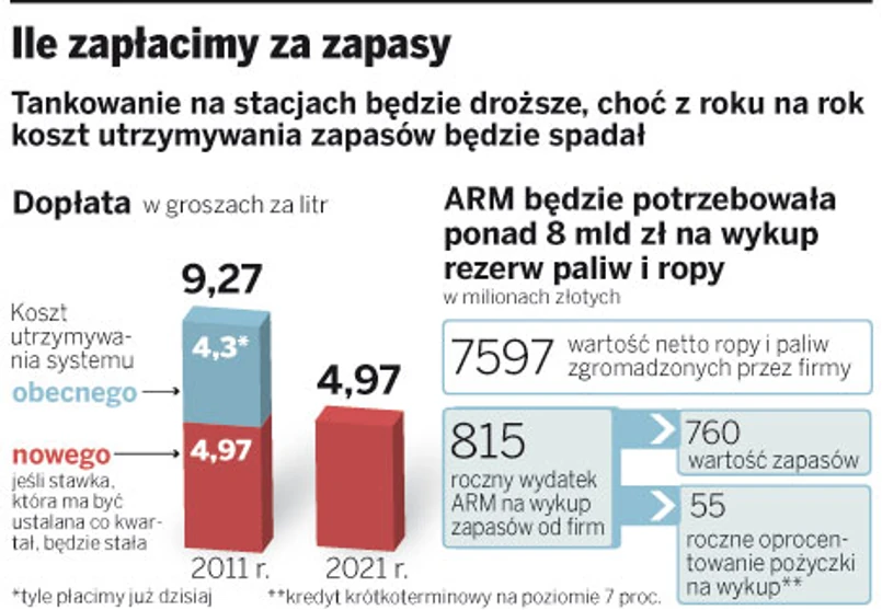 Resort gospodarki wyliczył, że na wykup wartych 7,59 mld zł zapasów będzie musiał zaciągnąć co roku kredyt w wysokości 760 mln zł. Przy oprocentowaniu kredytów krótkoterminowych na poziomie 7 proc. faktyczna kwota potrzebna do spłaty wyniesie jednak 815 mln zł rocznie. Aby zgromadzić taką sumę, ARM będzie musiała zebrać od firm paliwowych co roku 3,07 gr od każdego litra benzyny, diesla czy autogazu wprowadzonych do sprzedaży. Dodatkowo obciąży przedsiębiorców opłatą za utrzymywanie rezerw. A to kolejne 2 gr/l. Efekt? Za paliwo zapłacimy o co najmniej 5 gr więcej niż obecnie.