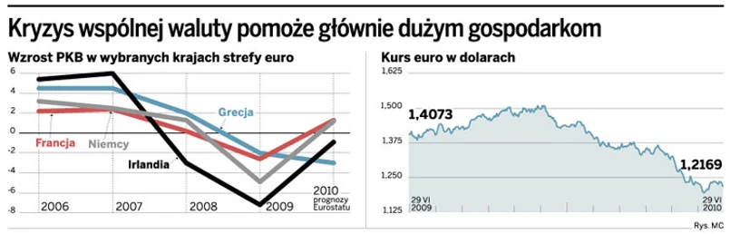 Silne osłabienie wspólnotowej waluty to dobra informacja przede wszystkim dla eksporterów krajów Eurolandu. Tak twierdzili przywódcy Europy, kiedy na początku maja konstruowali plan ratunkowy dla Południa. Według nich poprawę sytuacji gospodarczej ma zapewnić państwom takim jak Grecja czy Portugalia wzrost eksportu. Napędza go słaba waluta. W takiej sytuacji eksport poza Euroland, do USA (dolar umocnił się o 15 proc. do euro od początku roku) czy Wielkiej Brytanii (funt jest mocniejszy o ok. 8 proc.), staje się bardziej opłacalny.