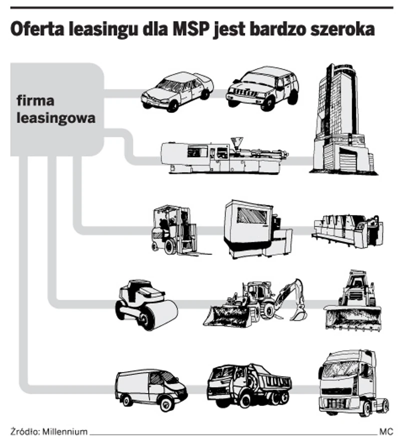 Leasingodawcy chętnie angażują się w transakcje w wielu sektorach gospodarki. Chlebem powszednim są maszyny budowlane, drogowe, poligraficzne, maszyny i urządzenia medyczne, maszyny do obróbki metalu i drewna, do przetwórstwa tworzyw sztucznych, dla przemysłu spożywczego, w tym też piekarniczego, a także wiele innych. Warto też wspomnieć, że swoje miejsce na rynku leasingu znajdują nietypowe w skali kraju projekty inwestycyjne o znacznych wartościach, sięgających nawet kilkudziesięciu milionów złotych. Warunki leasingu stworzone pod wymienione wyżej przedmioty pozwalają na przygotowanie oferty uwzględniającej bieżącą sytuację klienta, ewentualną sezonowość jego przychodów przy atrakcyjnej opłacie wstępnej.