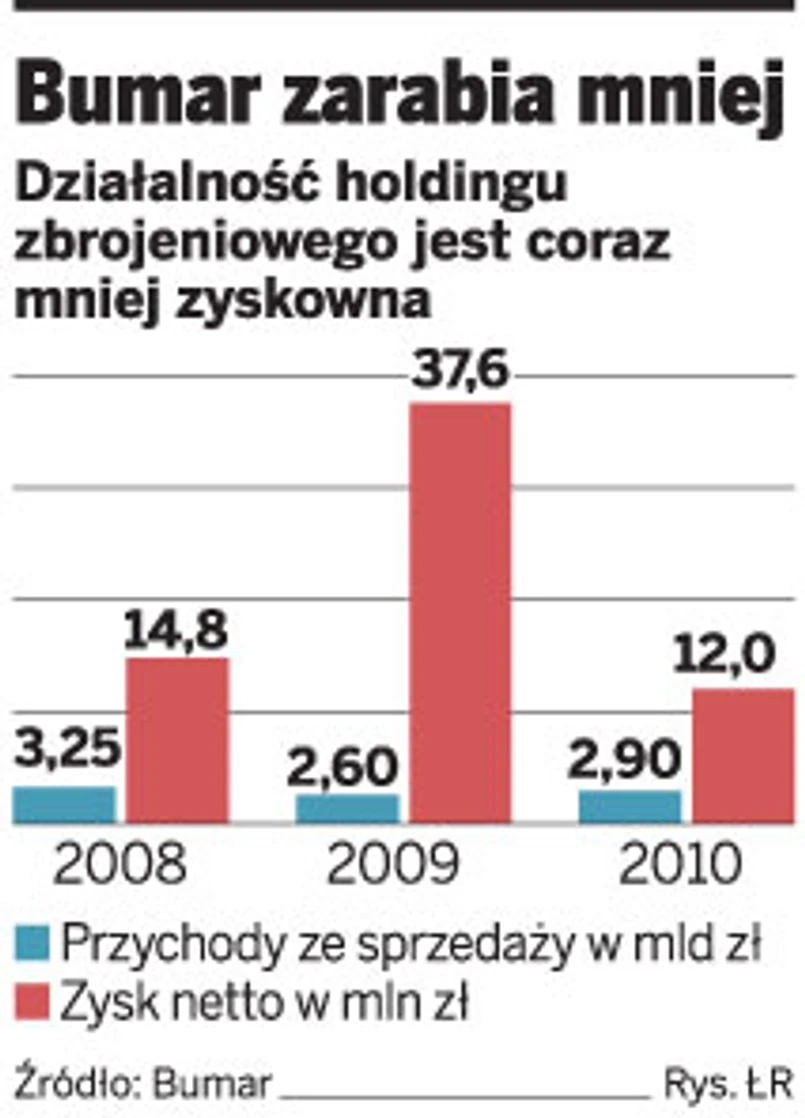 Tegoroczny wynik mocno podreperowało jednak wniesienie do grupy w styczniu 2010 r. przez Skarb Państwa siedmiu spółek kontrolowanych przez Ministerstwo Skarbu lub Agencję Rozwoju Przemysłu. W koncernie znalazły się m.in. Przemysłowy Instytut Telekomunikacyjny, Bydgoskie Zakłady Elektromechaniczne „Belma”, Fabryka Urządzeń Mechanicznych i Sprężyn „FUMiS-bumar”, Przedsiębiorstwo Handlu Zagranicznego „Cenzin” i Przedsiębiorstwo Produkcyjne Podzespołów Elektronicznych „Dolam”. W rezultacie tej operacji nie tylko wzrosną przychody, ale o 258 mln zł, do ponad 1 mld zł, zwiększył się też kapitał zakładowy spółki. Gdyby nie to, już w tym roku mogłoby w Bumarze być źle.
