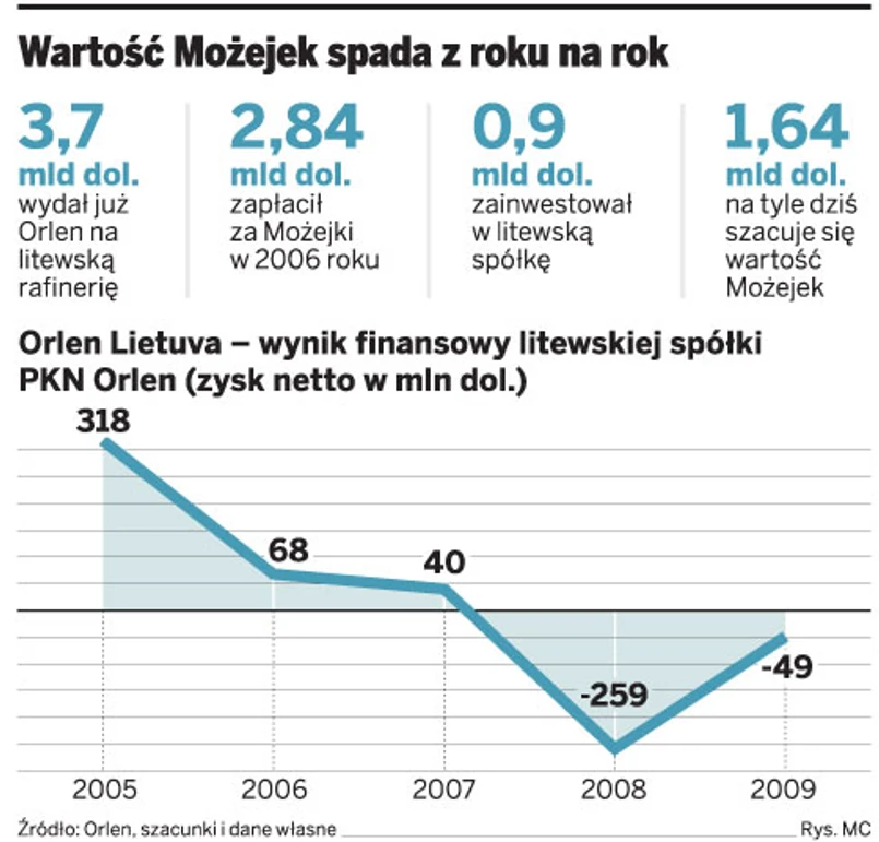 Orlen chce mieć wpływ na koszty przeładunku produktów naftowych w morskim terminalu, bo inaczej trudno wymagać od niego, by zainwestował 100 mln dol. w budowę rurociągu paliwowego, łączącego Kłajpedę z rafinerią. Bez tych inwestycji płocka spółka nie ma co myśleć o poprawie rentowności Możejek.