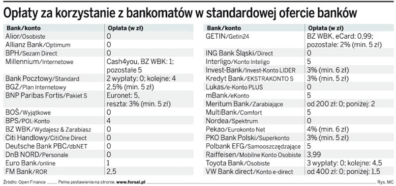 Na początku roku tylko w Alior Banku i Deutsche Banku zwykli klienci mogli bez opłat wypłacać pieniądze w całym kraju. Inne banki poszły w ślad tej dwójki. Obecnie na 31 sprawdzonych banków już w 11 oferowane są bezpłatne wypłaty ze wszystkich bankomatów w Polsce. Tyle że część tych instytucji podniosła inne opłaty. ING Bank Śląski i Allianz Bank na przykład zdecydowały się na podniesienie stawek za korzystanie z kart: w ING opłata wzrosła z 3 do 5 zł, a w Allianz Banku zamiast zapłacić 15 zł za trzy lata, teraz klienci płacą 1 zł co miesiąc (czyli w ciągu trzech lat płacą 36 zł). – Także MultiBank od sierpnia będzie oferować bezpłatne bankomaty, ale w zamian wzrosną inne opłaty – mówi Mateusz Ostrowski z Open Finance.