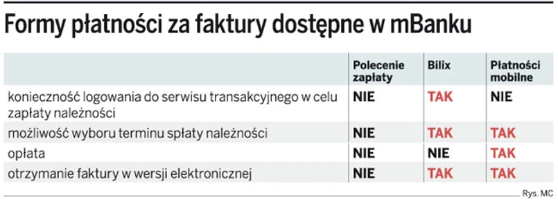 Jak działa płatność mobilna? W przypadku mBanku wystarczy się zarejestrować w serwisie transakcyjnym. Od tej chwili wystawcy faktur przesyłają ją do InPostu, który informuje klienta SMS-em lub e-mailem, że faktura jest wystawiona i w dowolnym momencie może zostać zapłacona. Wystarczy wysłać SMS lub e-mail z numerem transakcji. – Nie trzeba się logować do systemu. Inaczej niż w przypadku tradycyjnego polecenia zapłaty, żadne środki z rachunku nie są pobierane, dopóki nie będzie informacji zwrotnej od klienta – zapewnia Krzysztof Olszewski, rzecznik mBanku. Miesięczna opłata wynosi 1 zł.