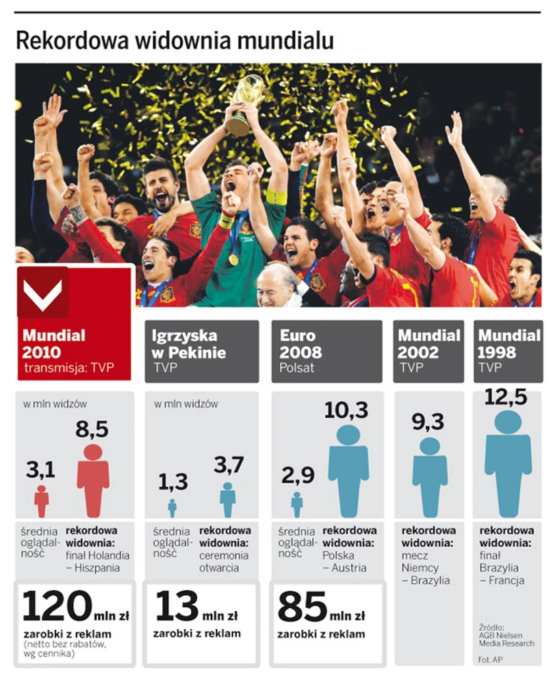Gdy Andres Iniesta w 116. minucie finału strzelał zwycięskiego gola do bramki Holandii, oddech wstrzymali nie tylko hiszpańscy i holenderscy kibice zgromadzeni na stadionie w RPA, ale też widownia siedząca w Polsce przed telewizorami. Tegoroczne mistrzostwa, choć bez udziału naszej reprezentacji, przyciągnęły przed ekrany prawdziwe tłumy – finał oglądało 9 mln osób. – Większą oglądalność miał chyba tylko śp. papież Jan Paweł II – mówi jeden z menedżerów z Woronicza. Choć kibice skarżyli się, że TVP nie stanęła na wysokości zadania, bo w studiu komentatorskim brakowało znanych nazwisk, a eksperci zaliczali wpadkę za wpadką, to mundial i tak okazał się jej gigantycznym sukcesem finansowym. – Wyniki przerosły nasze oczekiwania – przyznaje szef biura reklamy TVP Zbigniew Badziak.