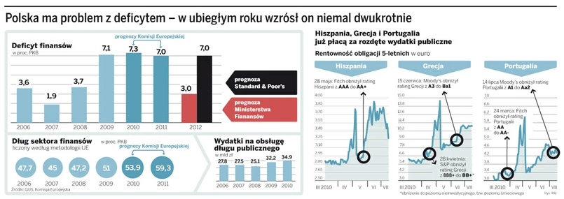 S&P przewiduje, że do 2012 r. rząd, mimo większości w Sejmie i sprzyjającego mu prezydenta, nie podejmie zdecydowanych działań w celu uzdrowienia finansów publicznych. „W perspektywie wyborów parlamentarnych w 2011 roku nie spodziewamy się, aby rząd ruszył ze znaczącymi oszczędnościami budżetowymi przed 2012 rokiem” – czytamy w raporcie. Eksperci ostrzegają przed bardzo szybkim wzrostem zadłużenia kraju spowodowanym o wiele większymi wydatkami państwa niż jego dochodami. Ich zdaniem już w tym roku dług osiągnie 55 proc. PKB, a w średnim okresie – 60 proc. PKB.