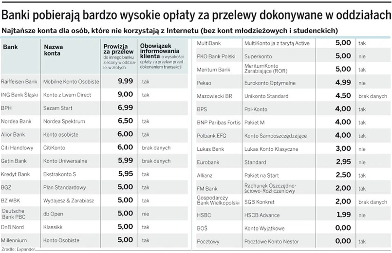 – Odwrotną sytuację mamy w ING, gdzie konto jest bezpłatne, ale przelew kosztuje 9 zł – mówi Jarosław Sadowski z Expandera. Oczywiście takie opłaty dotyczą osób posiadających w banku konto. Bo jeśli chcemy zrobić przelew w banku, w którym nie mamy rachunku, będzie to albo droższe, albo wręcz niemożliwe.