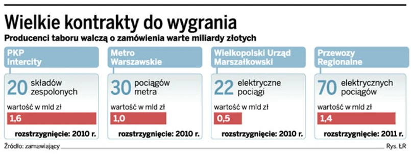 To kwota porównywalna do zakupu 20 szybkich pociągów dla PKP Intercity. Tutaj także rozstrzygnięcia można się spodziewać szybko. Trwający już dwa lata przetarg ma szansę wreszcie się zakończyć. Na prośbę startujących w nim firm termin składania ofert przesunięto aż o pół roku – na 8 września. Nowe pociągi, mogące się rozpędzać do 230 km/godz., chce wyprodukować i dostarczyć spółce PKP Intercity czterech potężnych graczy. O kontrakt starają się francuski Alstom, kanadyjski Bombardier, który do przetargu stanął wspólnie z Pesą, włoskie Ansaldobreda do spółki z nowosądeckim Newagiem oraz niemiecki Siemens.
