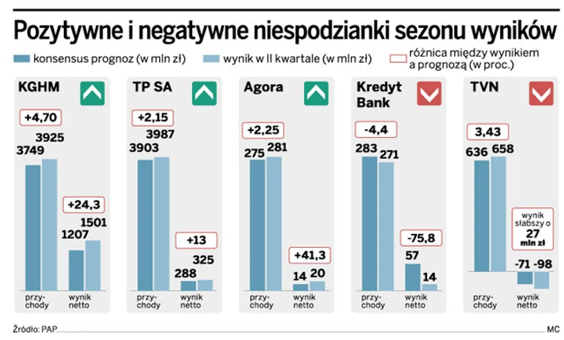 To, co pokazały firmy z GPW do tej pory, potwierdza tę opinię. W IDMSA, który pokrywa analizami ponad 60 spółek z warszawskiej giełdy, jak na razie wyniki zgodne z oczekiwaniami opublikowało osiem spółek: Bank Millennium, BZ WBK, Pekao, BRE Bank, Netia, ING BSK, Grupa Kęty i InterCars. Negatywnie zaskoczyły cztery: Kredyt Bank, GTC, CEDC i TVN, który zanotował tzw. papierową stratę netto z powodu osłabienia złotego. To spowodowało wzrost wartości długu spółki w euro. Poza tym wskaźnikiem analitycy dobrze ocenili wyniki firmy. Pozytywnie zaskoczyło analityków z kolei sześć spółek: Budimex, Bank Handlowy, KGHM, Agora, Świecie i Telekomunikacja Polska. To 33 proc. firm z całej osiemnastki.