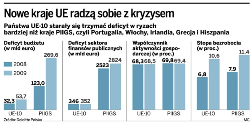 – Widać, że nowe kraje Unii także się zadłużały, ale robiły to bardziej wstrzemięźliwie – mówi Rafał Antczak, wiceprezes Deloitte. I dodaje, że region Europy Środkowo-Wschodniej nie stracił swojej pozycji względem państw piętnastki w czasie kryzysu, przynajmniej tej liczonej jako udział ich produktu krajowego brutto w PKB starej Unii. W 2008 roku wynosił on 10 proc. i rok później się nie zmienił.