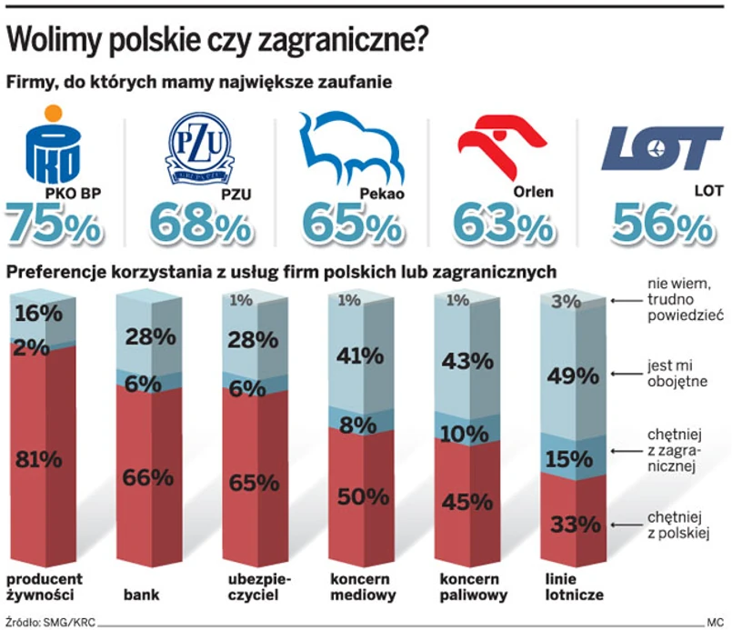 Co ciekawe, równie patriotyczne nastawienie mają klienci banków. Usługi instytucji, które uważamy za polskie (sektor bankowy jest w ponad 70 proc. w rękach zagranicznych) wybiera chętniej aż 66 proc. badanych, tylko 6 proc. bardziej ufa zagranicznym, a dla 28 proc. narodowość nie ma znaczenia.