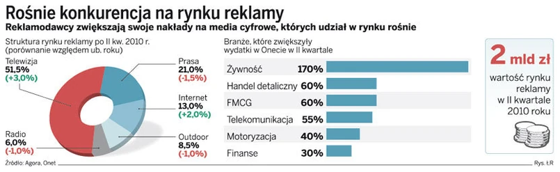 Do tych należy przede wszystkim Onet, największy portal w polskim internecie. W II kwartale br. liczba firm z branży żywnościowej reklamujących się w Onecie wzrosła o 50 proc., a ich budżety o 150 proc. W 2009 roku branża detaliczna obcięła wprawdzie wydatki w sieci, ale teraz wróciła, zwiększając swoje nakłady na reklamy aż o 70 proc.