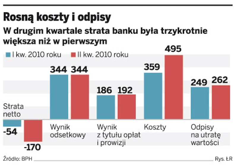 Tak złych wyników banki nie raportowały nawet w kryzysie. Wczoraj BPH poinformował, że w II kwartale tego roku miał stratę w wysokości aż 170 mln zł. Łącznie z pierwszym kwartałem oznacza to 224 mln zł pod kreską. Analitycy nie liczyli na wynik na plusie, ale prognozowali, że strata w pierwszym kwartale będzie mniejsza o 27 mln zł.