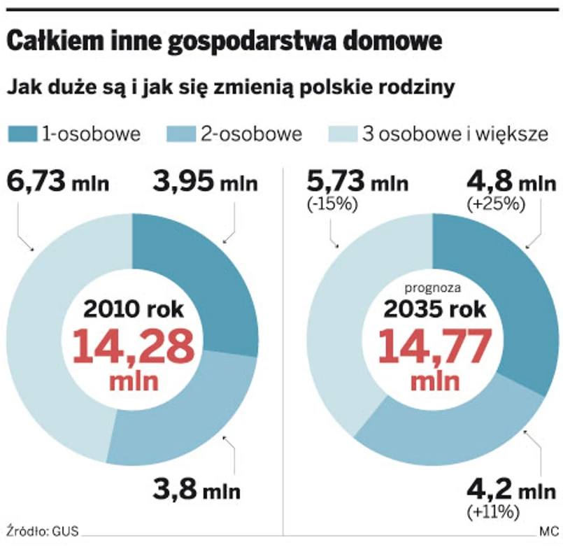 Z najnowszej analizy GUS wyłania się obraz kraju, w którym blisko dwie trzecie gospodarstw domowych będzie liczyło tylko jedną lub dwie osoby, a w ledwie co czwartym gospodarstwie będzie choćby jedno dziecko.