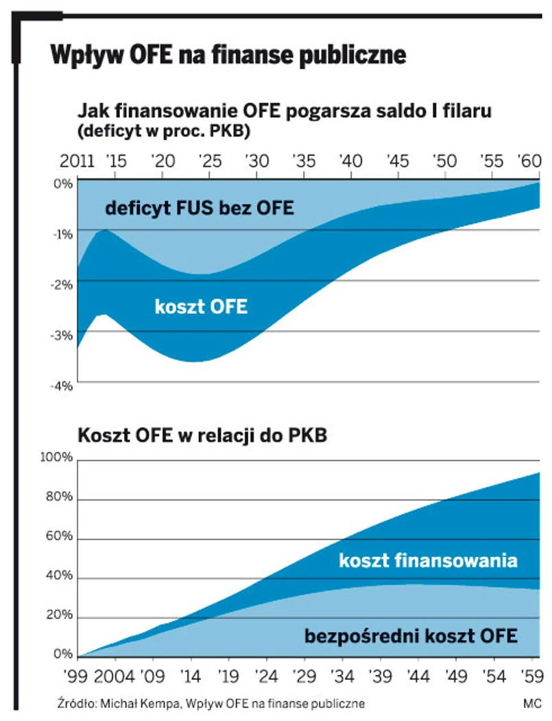 Jeszcze większy wpływ będą miały OFE na dług publiczny: będzie systematycznie rósł i w 2060 roku osiągnie (tylko z tego tytułu) 94 proc PKB.