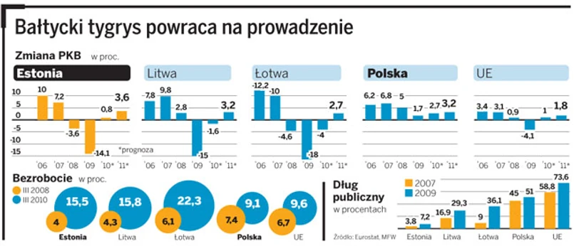 W 2009 r. estońska gospodarka runęła o 14,1 proc.; gorzej było tylko w czterech krajach świata. W tym roku według MFW jako jedyna republika bałtycka zanotuje niewielki, 0,8-proc. wzrost (Nordea oczekuje nawet 1,8 proc.). W 2011 r. wzrost na poziomie 3,6 proc. ma być po Słowacji i Rumunii najwyższy w UE.