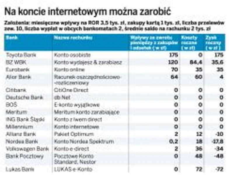 Wspólnie z Kontomierzem sprawdziliśmy, ile rocznie kosztuje klienta zarabiającego 3,5 tys. zł rachunek internetowy. Założyliśmy, że średnie saldo na takim rachunku wynosi 2 tys. zł, klient dokonuje 10 przelewów miesięcznie, płaci kartą rachunki w wysokości 1 tys. zł i 2 razy w miesiącu wypłaca pieniądze z obcego bankomatu. Okazało się, że spośród 88 sprawdzonych rachunków internetowych prowadzonych przez nasze banki 10 jest naprawdę za darmo. Mało tego – w niektórych przypadkach można nawet na koncie zarobić. Najwięcej – w przypadku Toyota Banku.