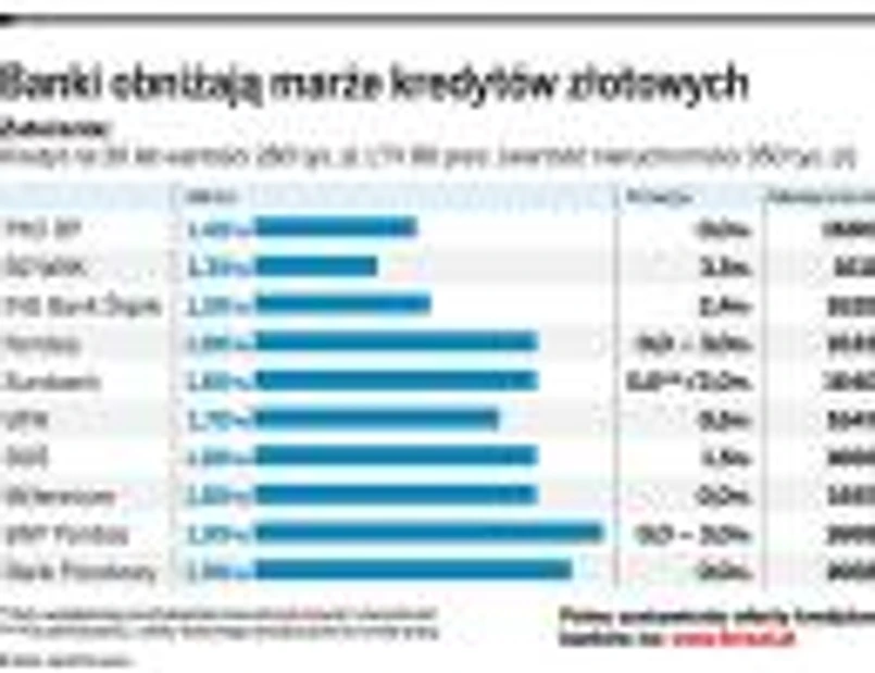 Promocja obowiązuje też w DnB Nord. Jeśli klient starający się o kredyt założy w banku konto z kartą, może liczyć na marżę w wysokości 1,7 proc. (dla kredytów w przedziale 300 – 500 tys. zł) lub 1,4 proc. (dla kredytów powyżej 500 tys. zł). W Lukas Banku w ramach promocji klienci nie płacą prowizji. Największą obniżkę wprowadził jednak BPH, który do tej pory stosował chyba najwyższe opłaty na rynku. Marże hipotecznych kredytów złotowych spadły aż o 2,6 pkt proc. Dla posiadaczy rachunku w banku, na który wpływa pensja, może być ona obniżona o kolejne 0,5 proc. Przy 20-proc. udziale własnym marża dla kredytu złotowego zmniejszyła się z 4,8 do 1,7 proc.