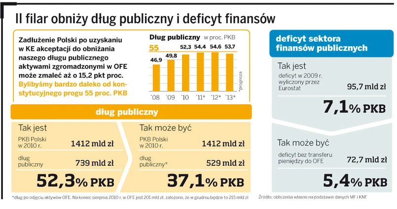 • Inna klasyfikacja długu – to postulat wynikający z pierwszego. Istotny, gdyż transfery do OFE to obecnie około 1,7 proc. PKB, a dług z nich wynikający wynosi 15 proc. PKB. I te wielkości będą w najbliższych latach rosły, co oznacza, że nie spełnimy wymogów z Maastricht. A to jest warunek wejścia do strefy euro.