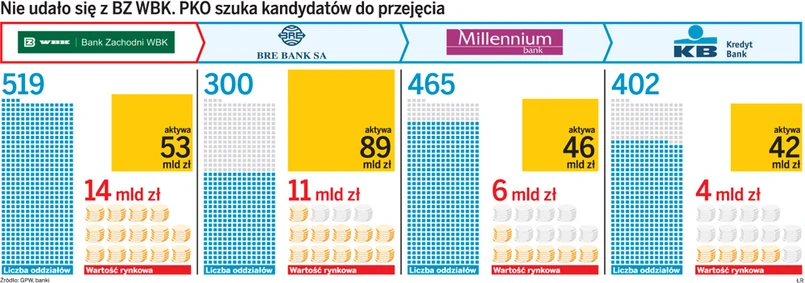 PKO, największy polski bank, nie będzie czekał na ostateczne rozstrzygnięcia w kwestii sprzedaży BZ WBK przez AIB. Jak się dowiedział „DGP”, od poniedziałku zaczyna się realizacja planu B – chodzi o kupno innej instytucji finansowej. Na celowniku są Millennium, Kredyt Bank i BRE Bank.