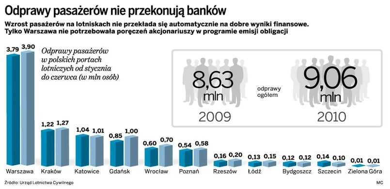 Jednak duże wątpliwości budzą również finanse krajowych portów, które taki pułap już osiągnęły. Adam Skonieczny z MPL Gdańsk, który odprawił w zeszłym roku ponad 1,8 mln osób, zapewnia, że spółka od lat generuje dodatni wynik finansowy. W zeszłym roku było to ponad 10 mln zł. Mimo to Nordea Bank Polska zdecydował się podpisać ze spółką umowę na emisję obligacji w kwocie 195 mln zł, dopiero gdy uzyskał poręczenie samorządu Gdańska i województwa pomorskiego. Sławomir Żygowski, I wiceprezes Nordea Bank Polska, zapewnia, że poręcznie było wyłącznie dodatkowym zabezpieczeniem.