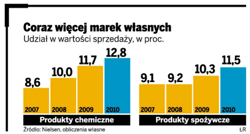 Na marki własne stawiają również takie polskie sieci, jak Żabka, czy dyskonty, takie jak Alma Market. Nic dziwnego. W zeszłym roku dyskonty miały ponad 18-proc. wzrost sprzedaży w porównaniu z 2008 r. W efekcie udziału dyskontów w rynku spożywczym zwiększył się z 7,7 proc. w 2008 r. do 9,1 proc. w 2009 r. A w tym, jak prognozują analitycy, przekroczy 10 proc.